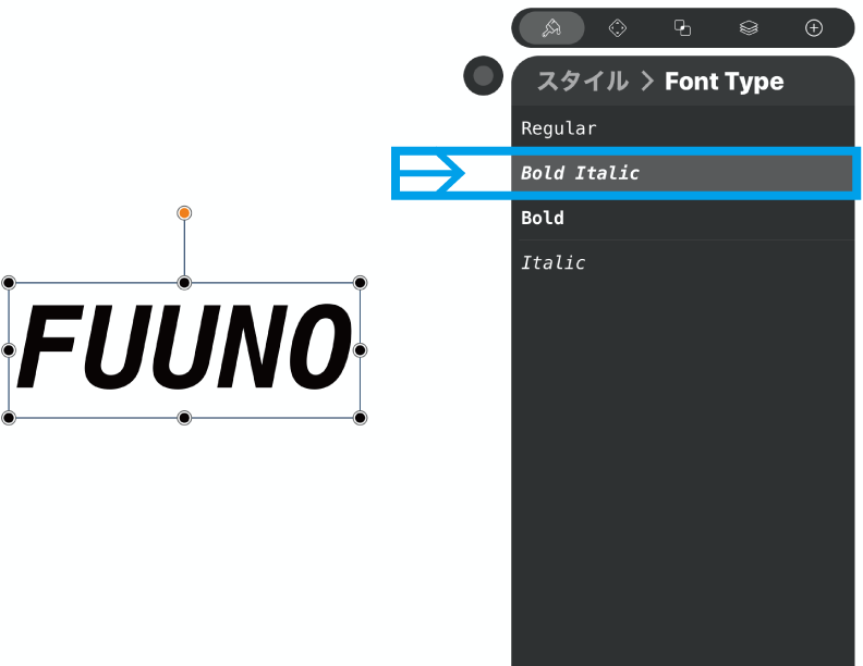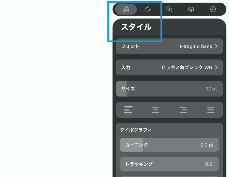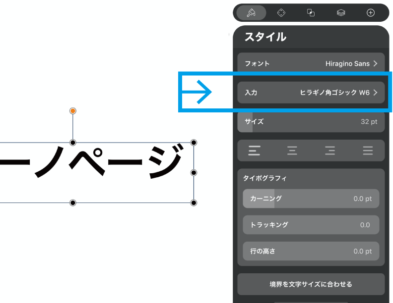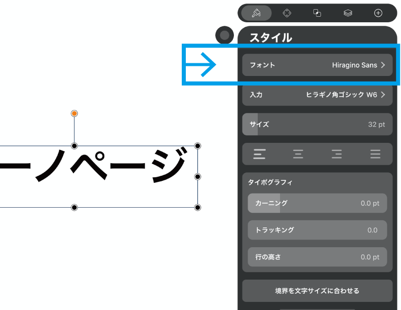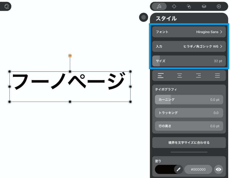 Vectornatorで文字を挿入するときはロゴやアイコン制作目的が多いと思うので、インスペクターパネルのスタイルでエディットしながら見ていくことにしましょう。