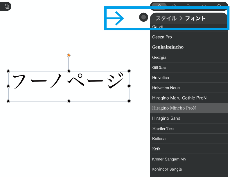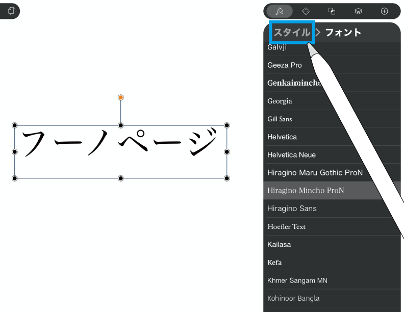 フォントを選んで元のスタイルタブに戻りたい時は「スタイル」の部分をタップします。