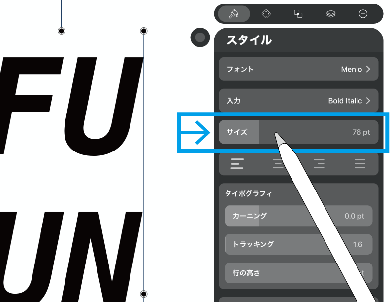 その下にあるのがフォントサイズのスライダーです。1〜300ptの範囲で指定することができます。