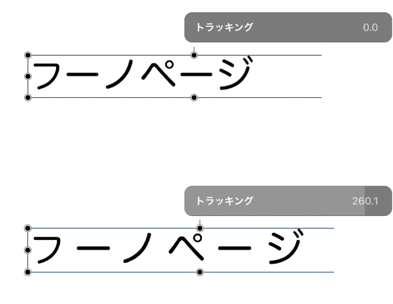 選択ツールでボックス全体を選択してスライダーを動かすと、全ての文字の隣接スペースが拡大/縮小します。