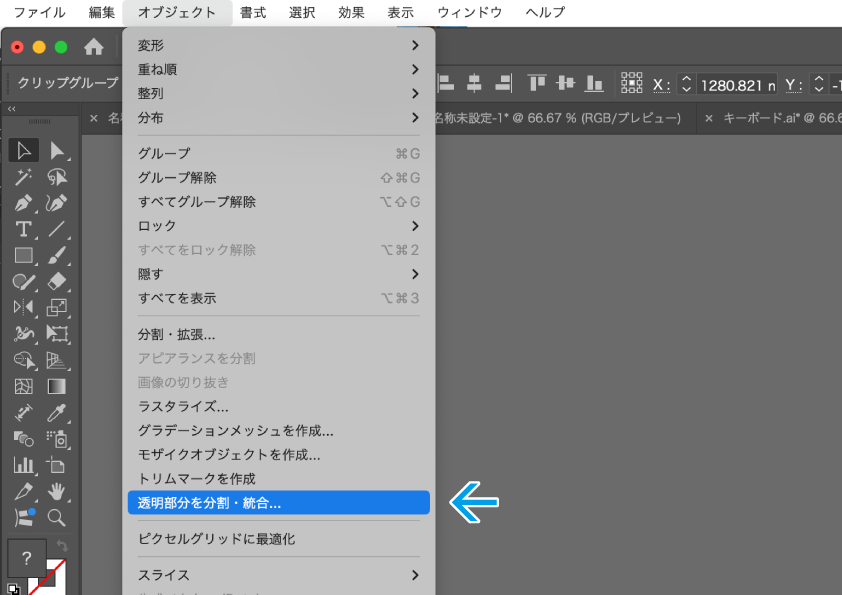 選択状態のまま画面上部のメニューバーから「オブジェクト」をプルダウンし、「透明部分を分割・統合」をクリックします。