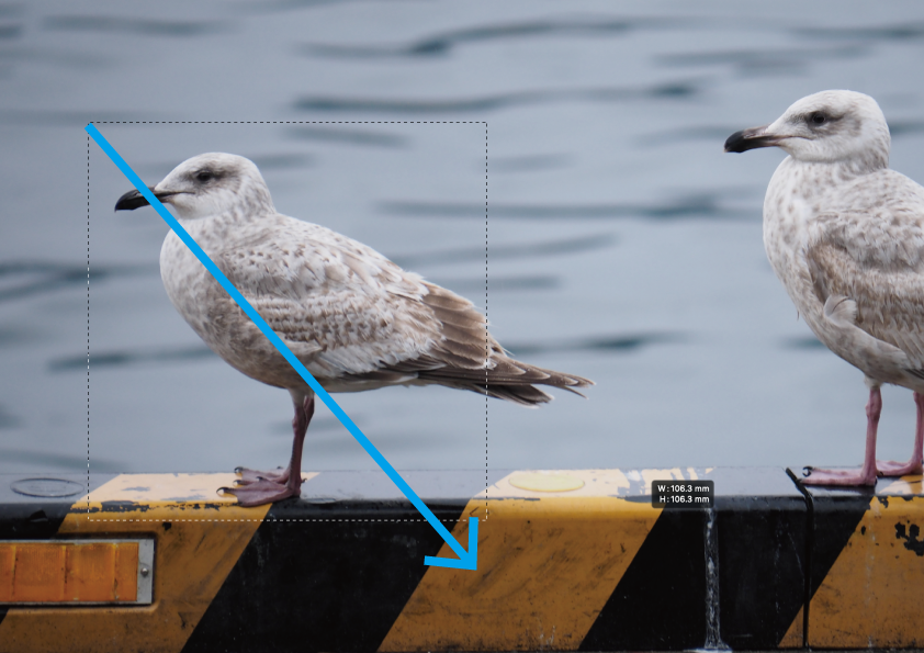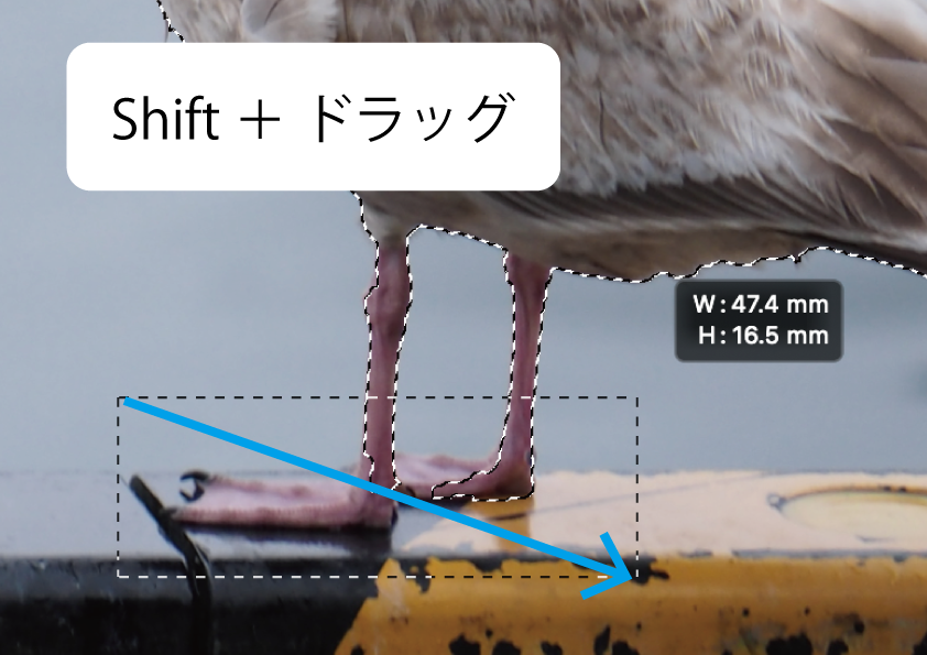 後ろにいるカモメ君を長方形ドラッグで選択したのですが、足の先っぽが含まれていません。